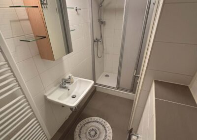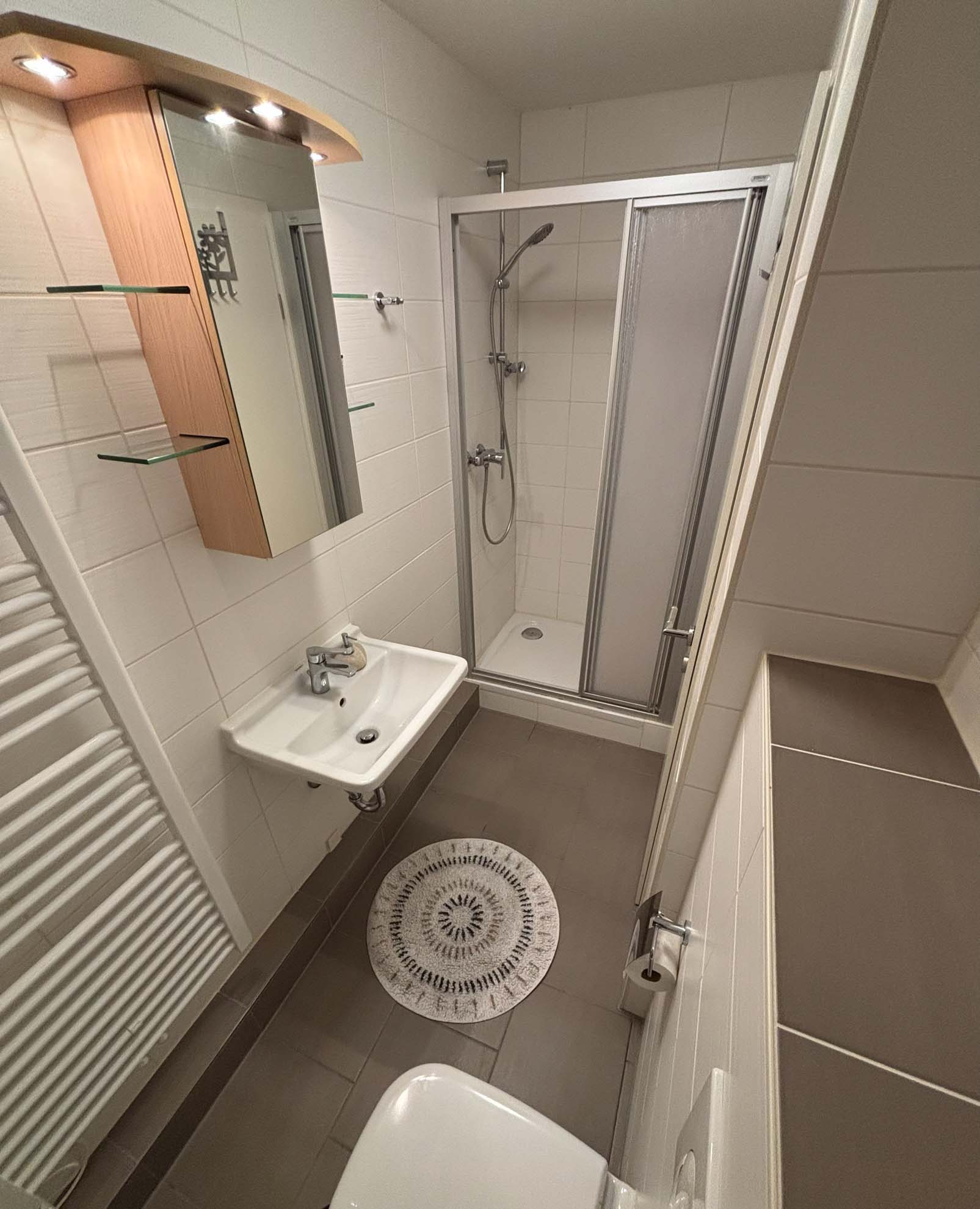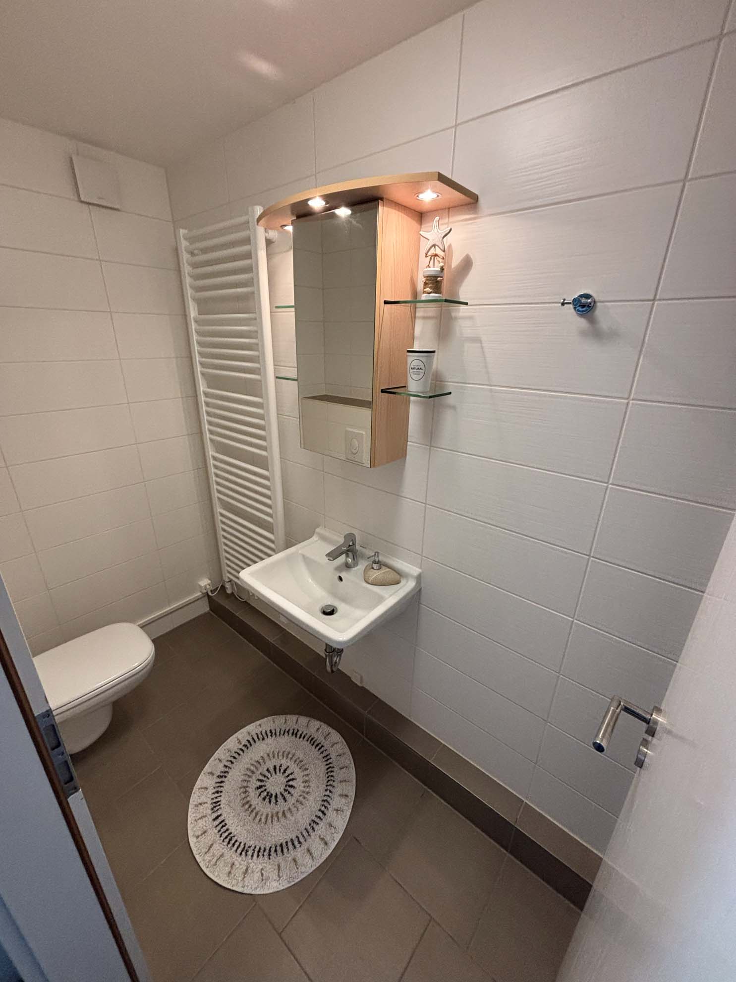 Das kleine aber gemütliche Bad ist mit einem Handtuchheizkörper ausgestattet sowie mit einem elektrischen Lüfter nach außen.