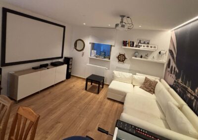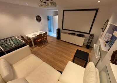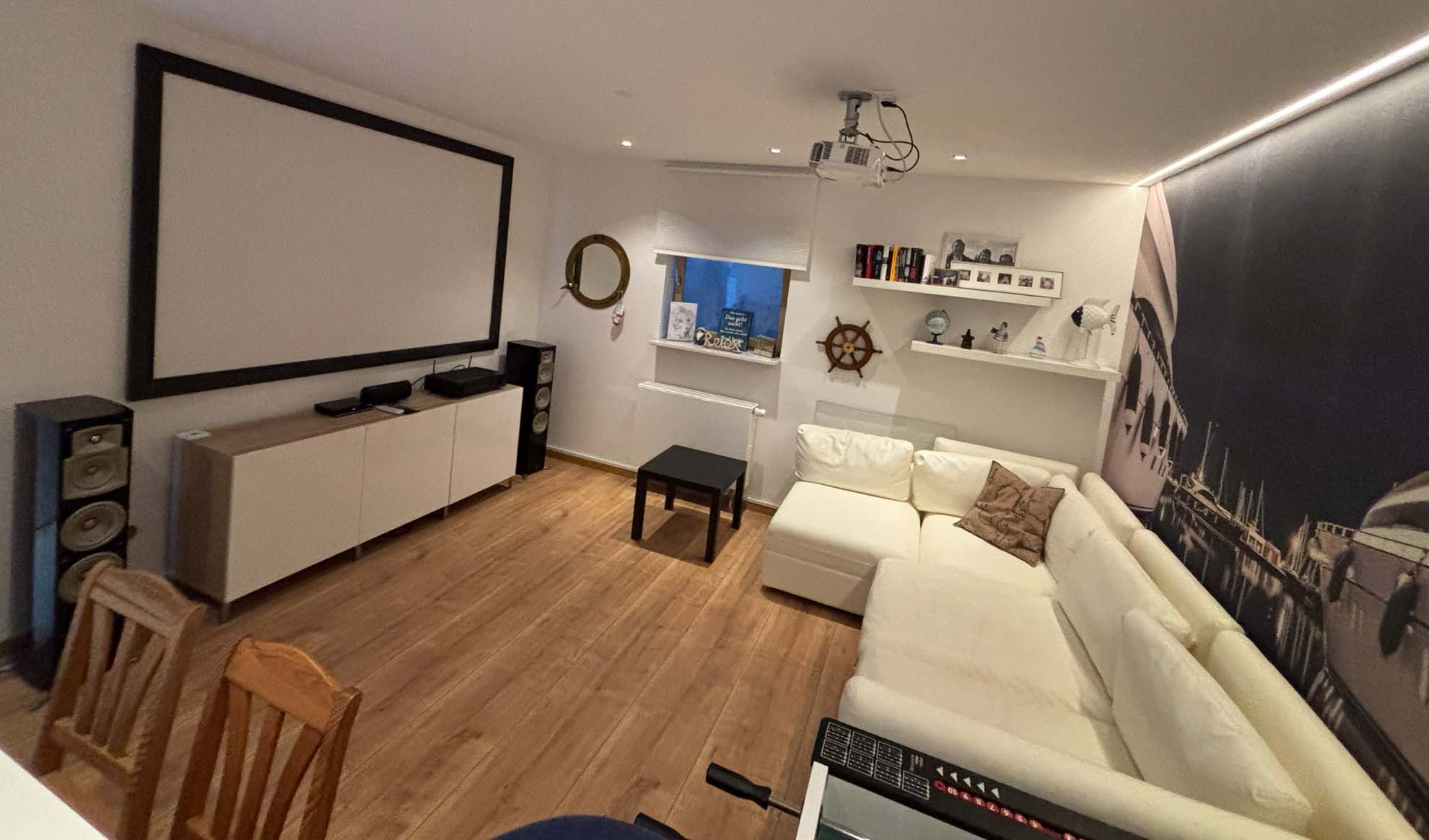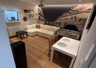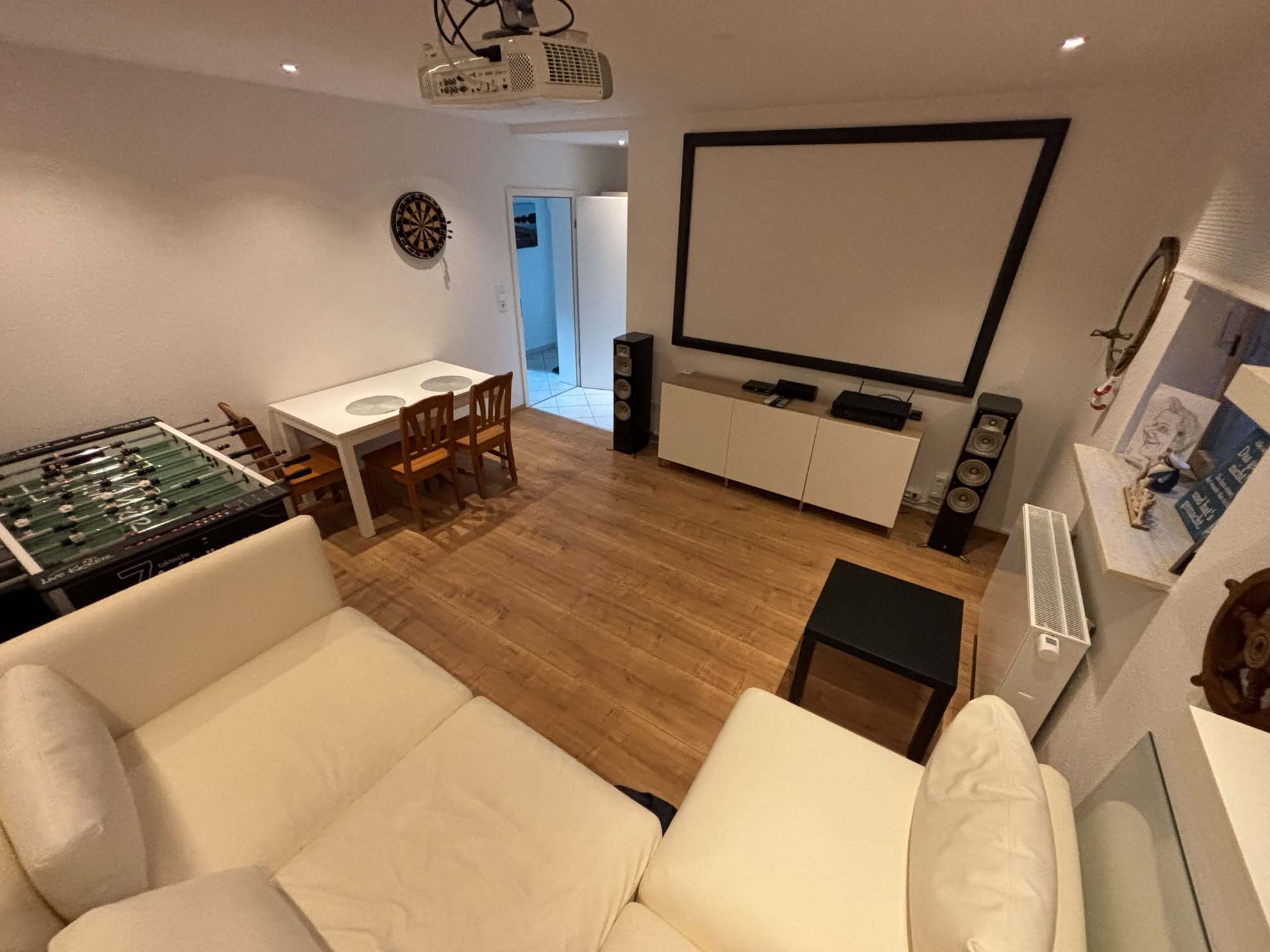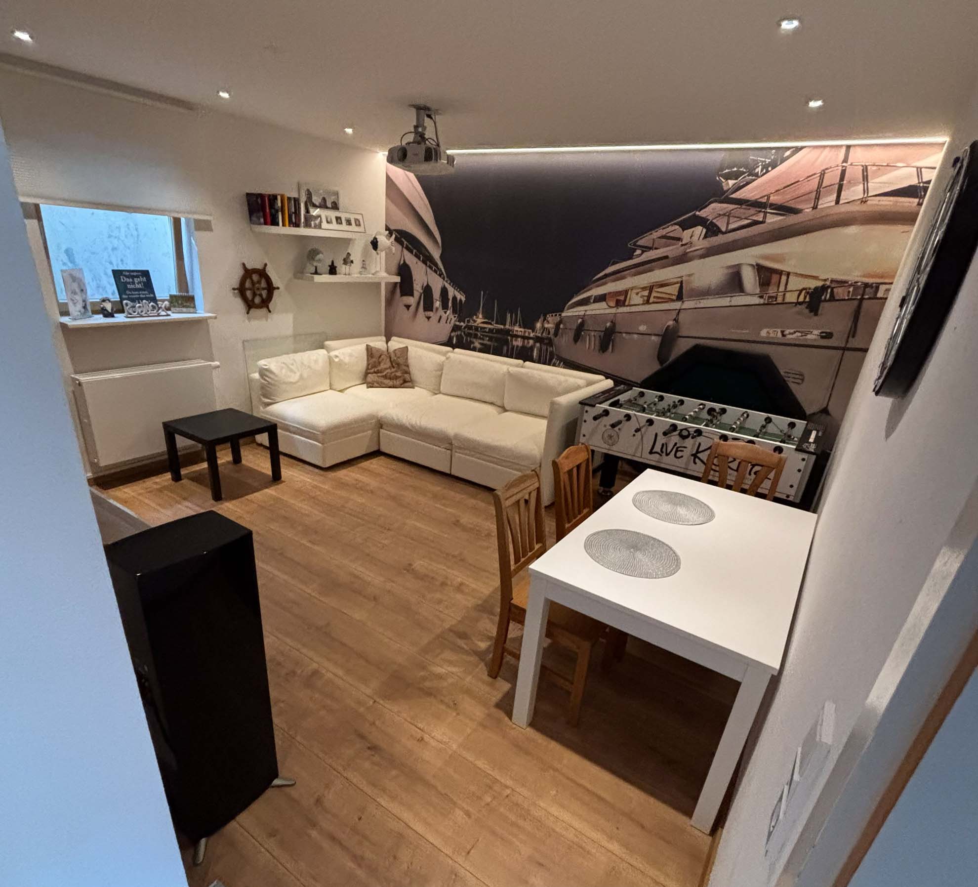 Im Wohnzimmer ist eine große, gemütliche Ledercouch der Mittelpunkt und sie lässt sich zu einem Doppelbett ausklappen. Sie bietet so noch einmal gemütlichen Schlafplatz für 2 Personen. Der HD-Beamer mit der großen Leinwand sorgt für ein perfektes Fernseh-und Kinoerlebnis. Die Foto-Dekortapete lässt das Gefühl aufkommen, in einem Hafen zu sitzen. Das Fenster im Wohnzimmer erhellt den Raum durch das Licht aus dem Lichtschacht, da das Haus auf der Rückseite im Hang steht.