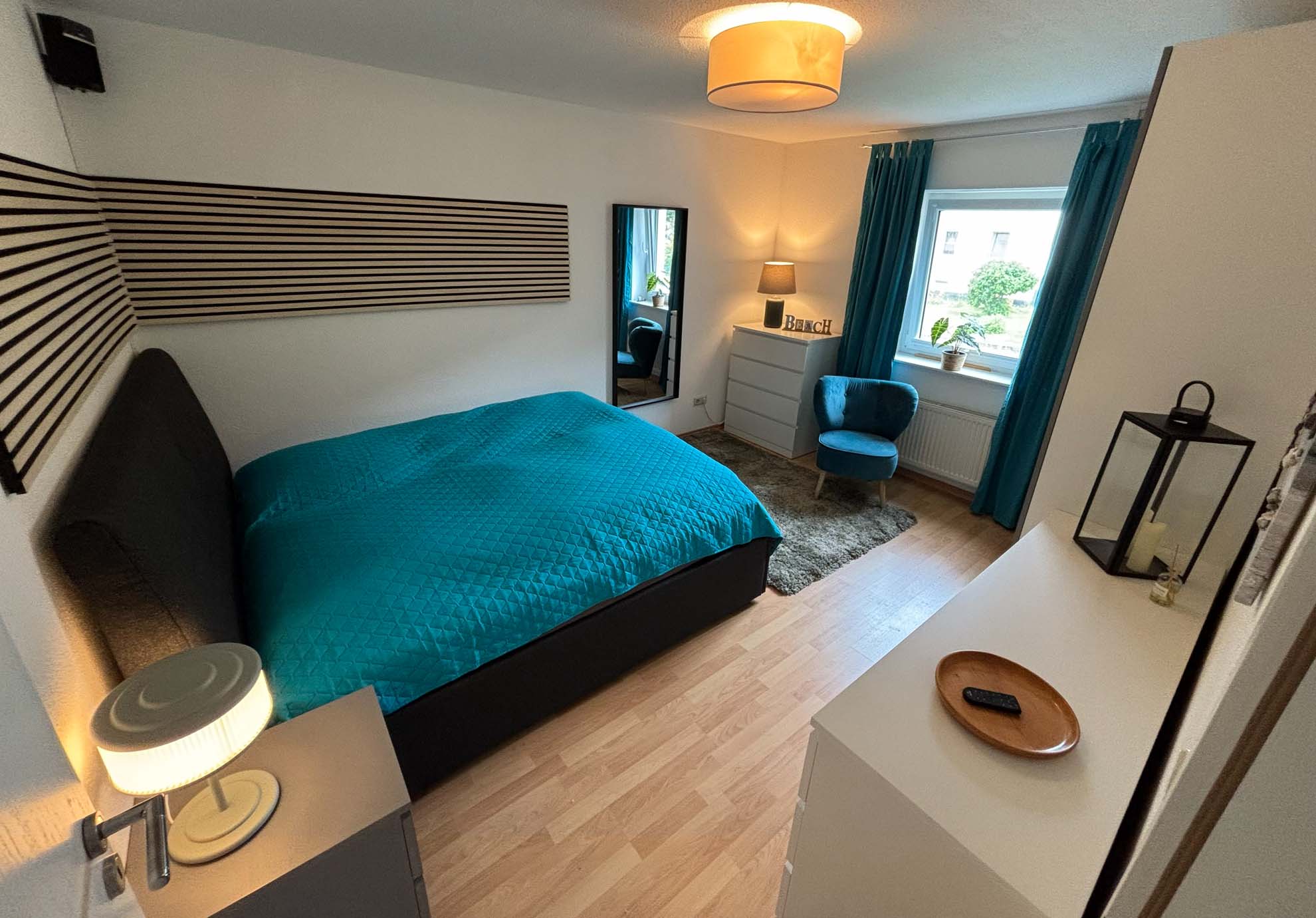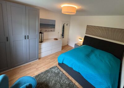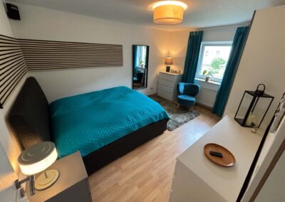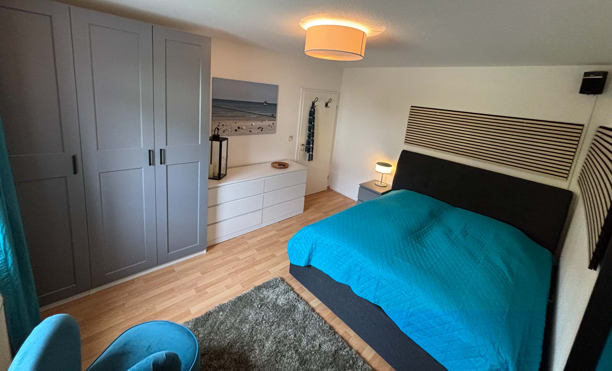 Das Schlafzimmer mit großem Kleiderschrank und Doppelbett ist durch hochwertige Matratzen und Topper für größtmöglichen Schlafkomfort eingerichtet. Das Fenster nach Osten zur Straße lässt morgens die Sonne grüßen.