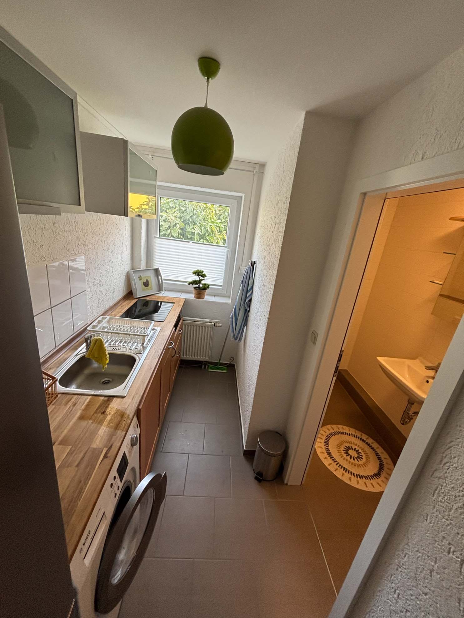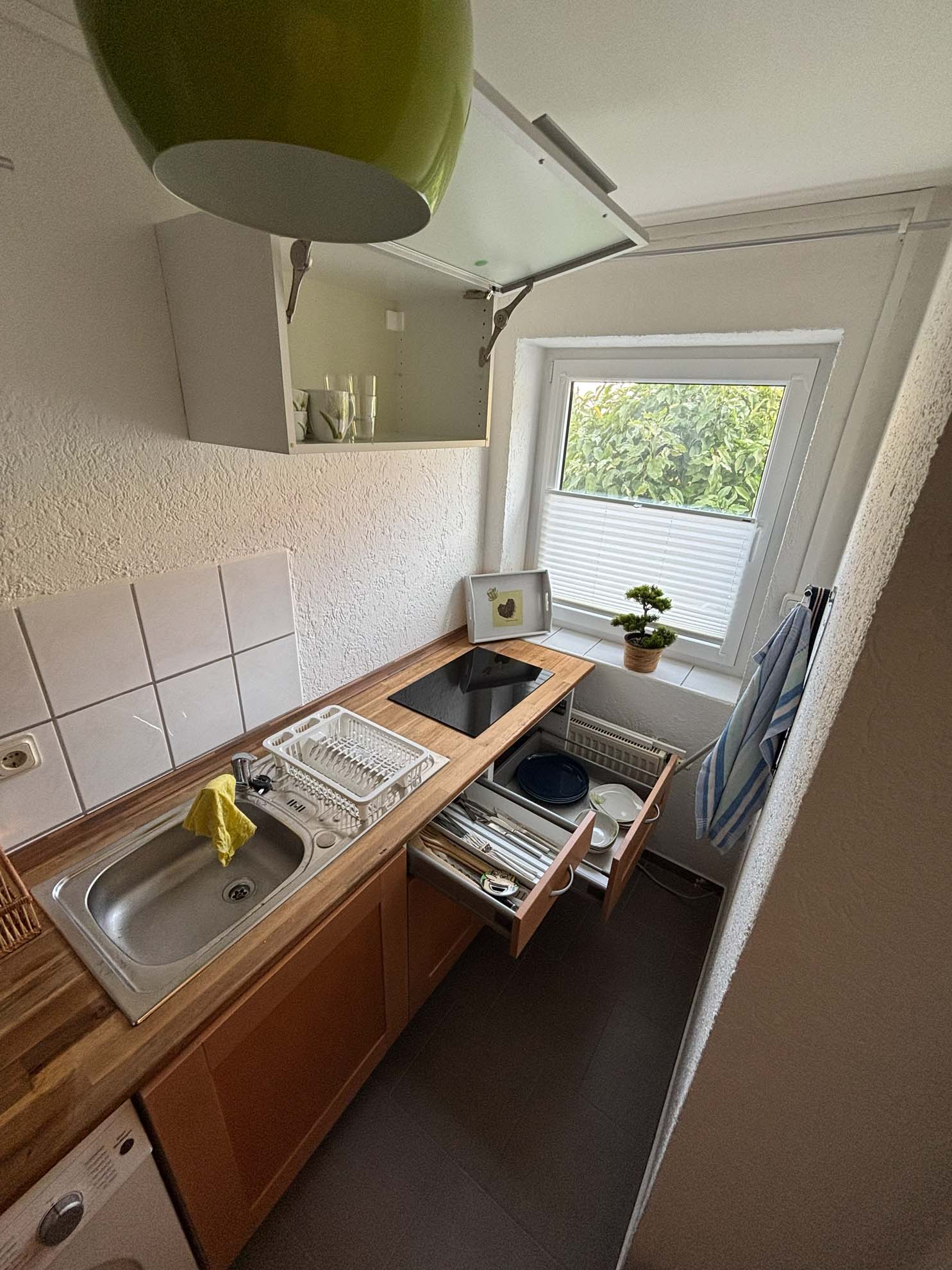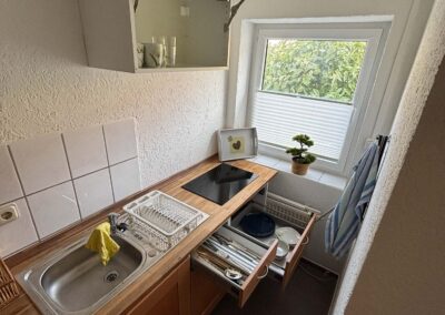 In der kleinen Küche lässt das Induktionskochfeld keine Wünsche offen. Ein großer Kühlschrank mit separatem Frostfach und eine Waschmaschine ergänzen sie.